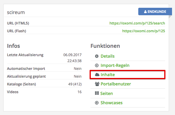 Um ein Video per iFrame direkt in HTML einzubetten benötigen Sie lediglich einen kurzen Code, der das gewünschte Video dann zum direkt Abspielen in der Seite anzeigt. Diesen erhalten Sie direkt beim Video in Ihren Portalinhalten in der OXOMI Verwaltungsoberfläche. Dorthin gelangen Sie, indem Sie zunächst in der Navigationsleiste auf “Portale” klicken. Hier in der Übersicht wählen Sie beim gewünschten Portal “Inhalte”.