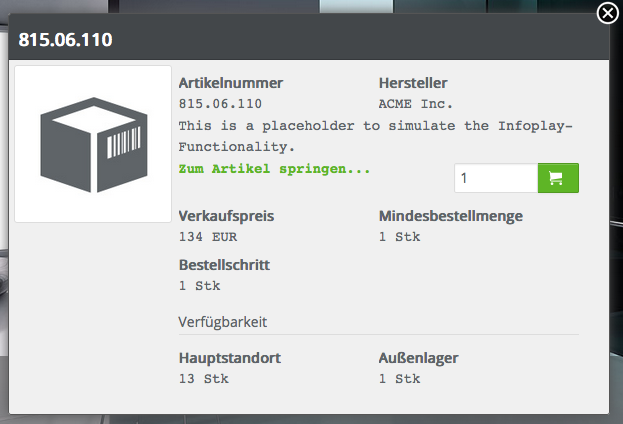 Hinweis: Sie können die Infoplay2.0-Funktionalität mit unseren Beispieldaten aus dem Portal "DEMO" mit der Artikelnummer "ST.001.A" testen.