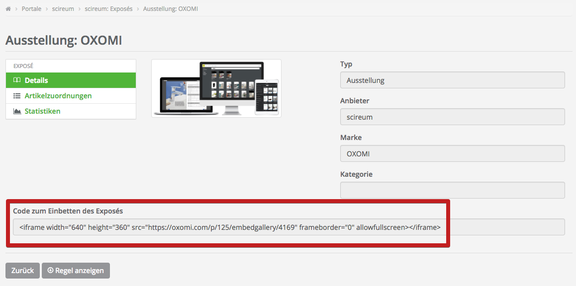 Dort links im Menü zu “Exposé” wechseln und in der Liste einfach auf das gewünschte Exposé klicken. Der Code zum Einbetten wird Ihnen direkt unter dem Exposé angezeigt.