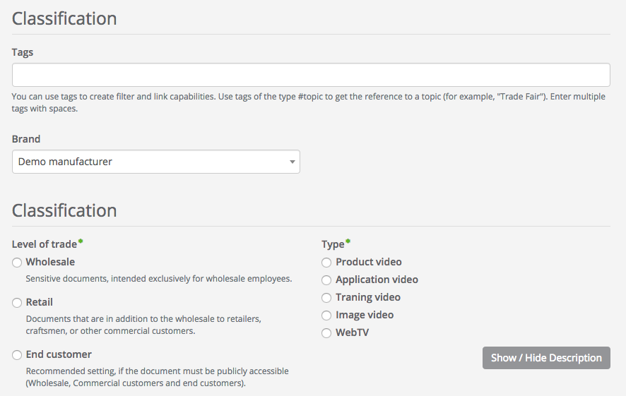 As with all content, settings for the file like tags, classifications, sharing options, internationalization and visibility of the video can be made at this point.