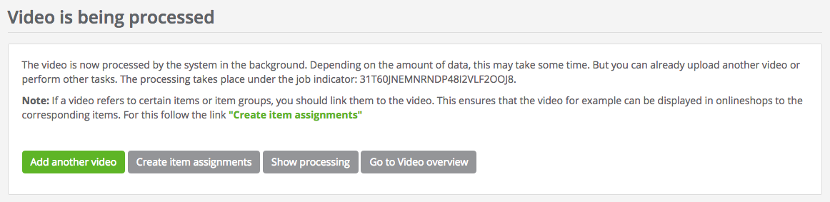 You can do this while the video is still being processed. This assignment allows the video to be displayed when the corresponding item numbers are called via the OXOMI interface. For example on the product page in an online shop. Assign videos with item numbers