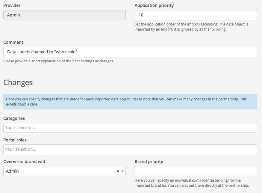 The brand is to be changed for all content imported with this rule and all data sheets are to be set to the “wholesale” trade level. To do this, we define two import rules that are processed in sequence by their application priority.