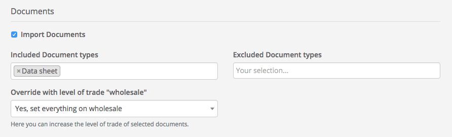 The first import rule, with the application priority "10" changes the level of trade for all documents of type "data sheet" to "wholesale" and changes the brand to the desired value. Other media types such as videos or galleries are excluded from the import rule.