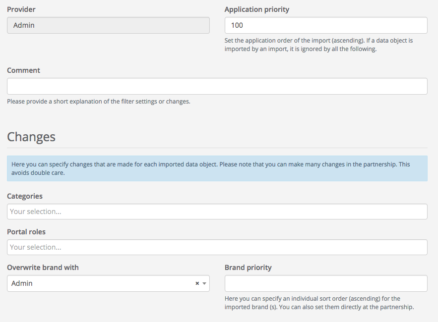 You can customize categories and portal roles. Furthermore, you can overwrite brands, change the brand sorting or assign tags.