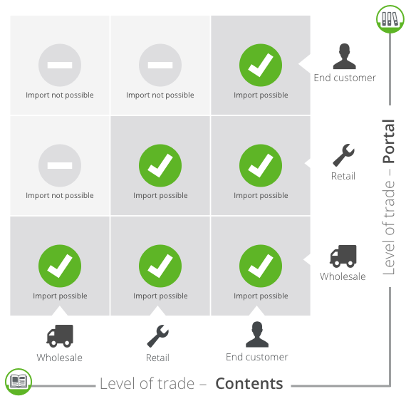 Anyone who uploads content into the system has to specify the level of trade. Wholesaler are not allowed to downgrade the level of trade choosen by the manufacturer (e.g. from wholesale to end customer). However, an upgrade of levels of trade is always possible (e.g. from end customer to retail). Therefore, the levels of trade can be adjusted via import rules within portals.