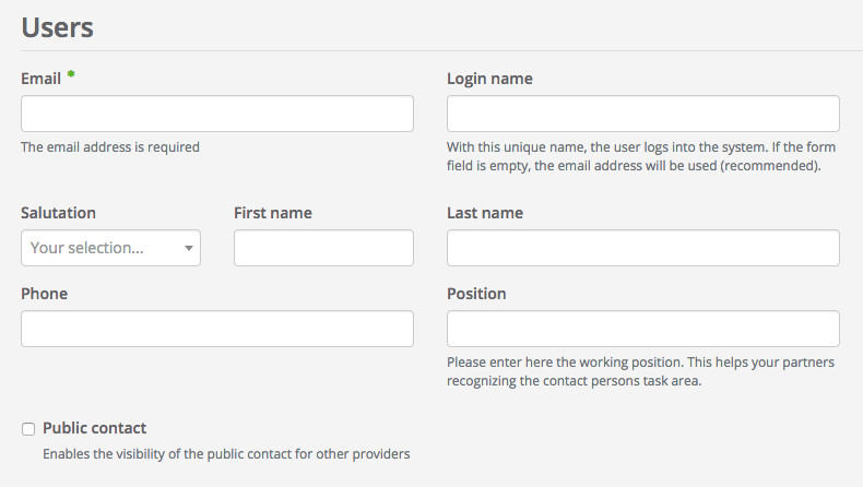 Further contact details, such as name and surname, phone number and position, are optional. By activating the option "Public contact", this user is displayed as a public contact person.
