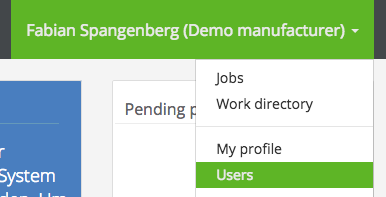 To create other users, your own account requires the permission "Manage company". If this is available, you are able to select "Users" from the drop-down menu at the top right of the navigation bar.