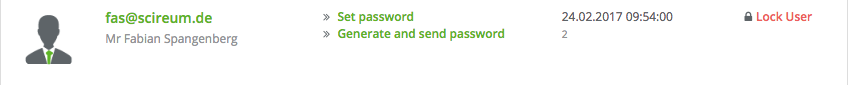 Finally give the newly created user an initial password so that he can log in. You have the option of assigning your own password or a system generated password. The latter is automatically sent to the new user via e-mail.